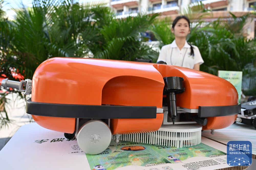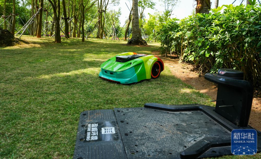 ↑ 3月25日,智能无人割草机在中国(海南)南海博物馆周边草坪上作业。