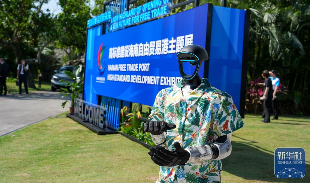 ↑ 3月24日,人形机器人在位于海南省琼海市博鳌镇东屿岛的高标准建设海南自由贸易港主题展上迎宾。