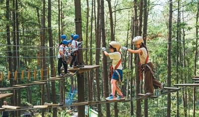 小朋友在四川省巴中市天马山森林康养旅游度假区体验“丛林穿越”户外项目。夏 雨摄(人民图片)