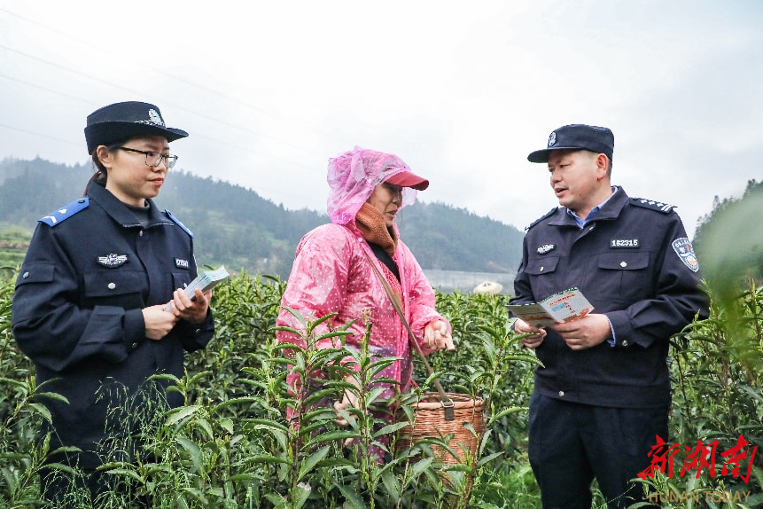 新湖南客户端3月26日讯(通讯员 彭昌剑 张红军)3月25日,正值辖区黄金茶园春茶采摘旺季,湘西土家族苗族自治州保靖县公安局葫芦派出所组织民辅警去到茶园,开展反诈、交通安全宣传活动,将安全知识送到茶农身边。
