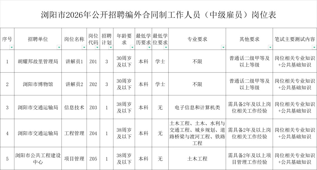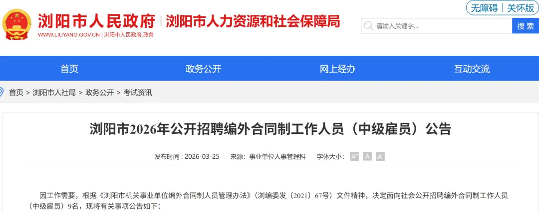 3月25日,浏阳市人力资源和社会保障局发布浏阳市2026年公开招聘编外合同制工作人员(中级雇员)公告。公告显示,因工作需要,根据《浏阳市机关事业单位编外合同制人员管理办法》(浏编委发〔2021〕67号)文件精神,决定面向社会公开招聘编外合同制工作人员(中级雇员)9名。