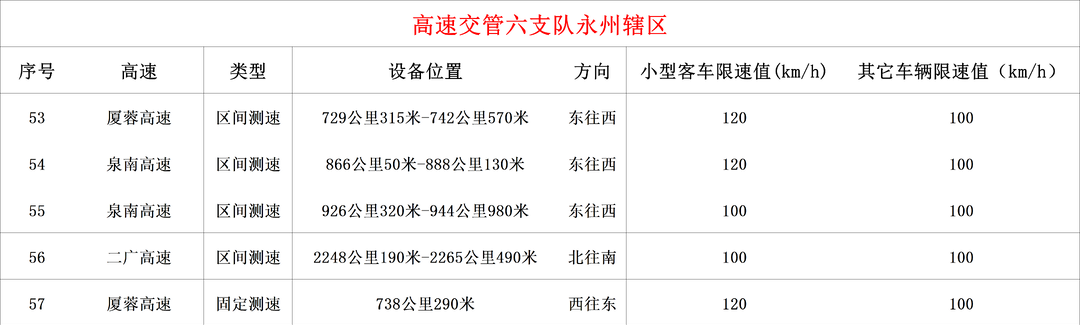 为深入落实《规范高速公路超速违法行为查处工作八项措施》,统筹发展与安全,回应群众对高速通行安全便捷的新期待,持续优化测速管控工作,自2024年5月以来,全省高速公路全面取消移动测速,并加快推进区间测速建设。此前已分四次动态更新测速点位,保障执法规范透明。针对当前事故多发易发路段的特点,为进一步有效预防道路交通事故,规范超速违法行为查处,现对相关点位优化调整,在现有208处测速点位的基础上,新启用57处、停止使用3处、调整1处。具体情况现向社会公布如下: