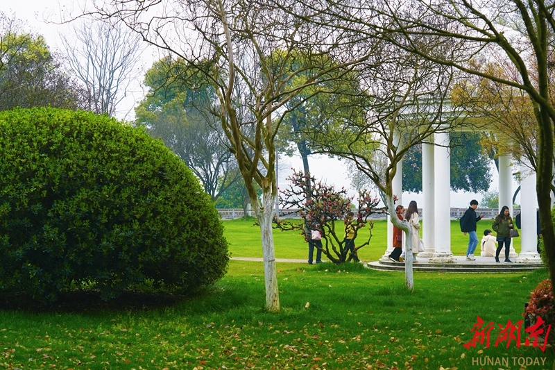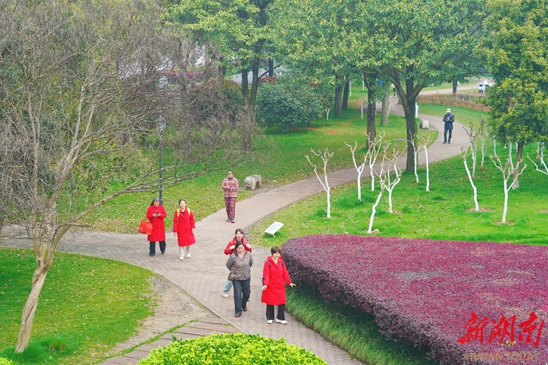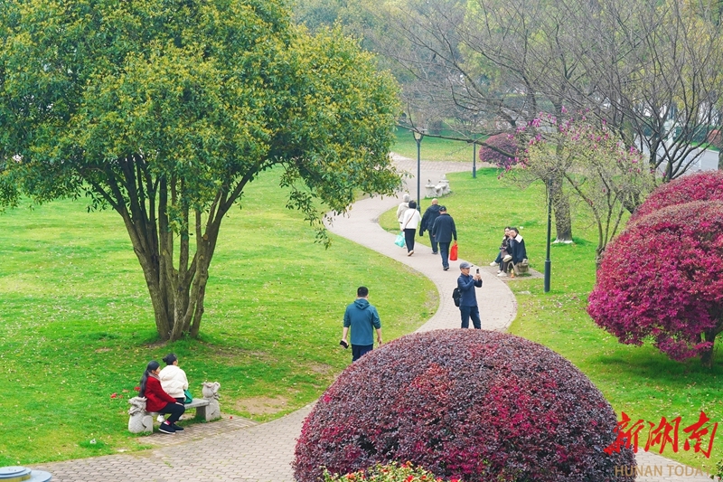On March 25, the Orange Isle Scenic Area in Changsha was full of greenery and blossoms in the spring air. Residents and tourists strolled around the area, immersing themselves in the picturesque scene. (Photo/Xu Xing, Hunan Daily)