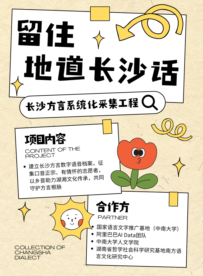 国家语言文字推广基地(中南大学)、阿里巴巴AI Data团队、中南大学人文学院牵头,湖南省哲学社会科学研究基地南方语言文化研究中心协办的“长沙方言系统化采集工程”已正式启动!