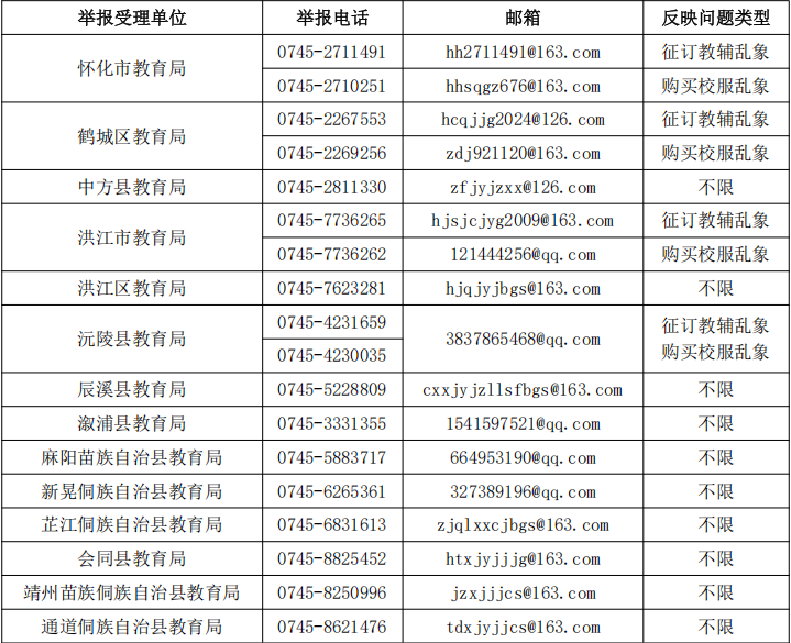 为持续深化全市教育领域群众身边不正之风和腐败问题集中整治,纠治中小学征订教辅、购买校服乱象,切实维护学生及家长合法权益,现将怀化市2026年纠治征订教辅、购买校服乱象监督举报渠道公告如下: