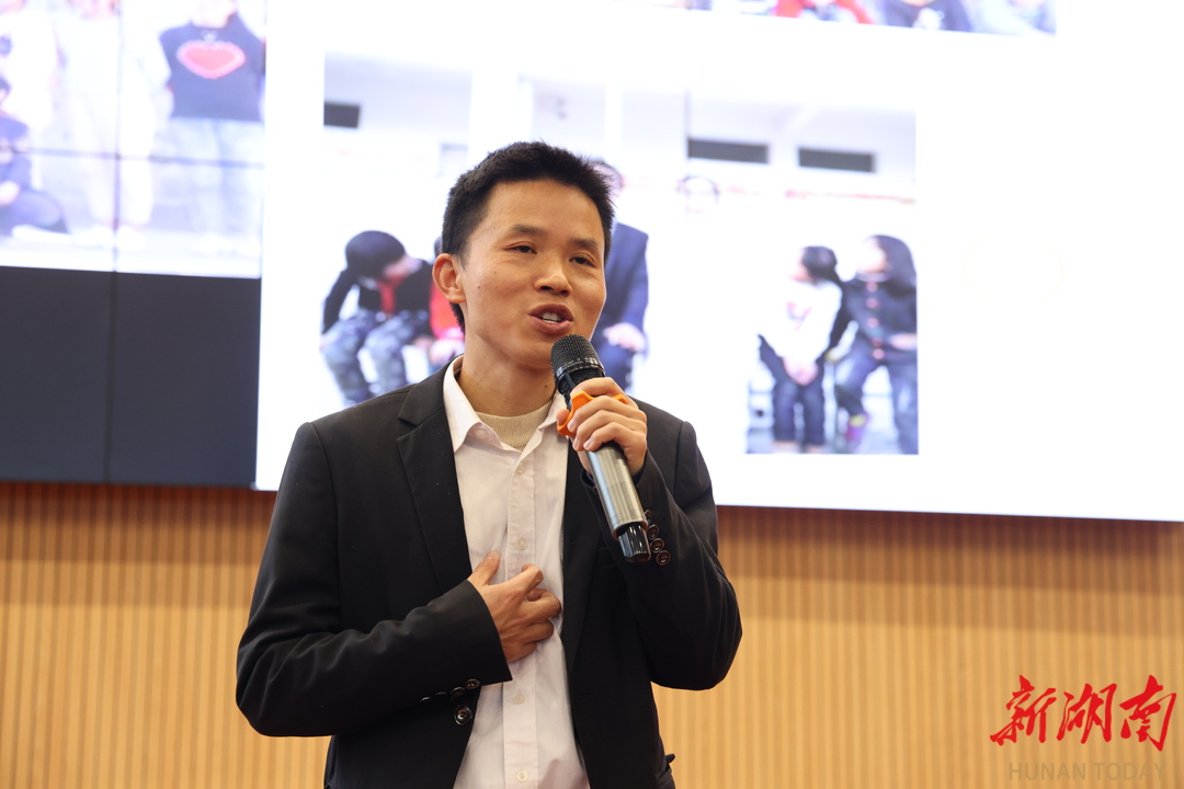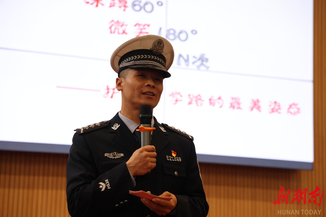 分享会上,“湖南好人”“湖南省最美志愿者”邓苞苞率先开讲。他常年坚守护学一线,与孩子们击掌互动,在《以爱击掌,温暖护学》的分享中,讲述了守护交通安全的点滴日常。