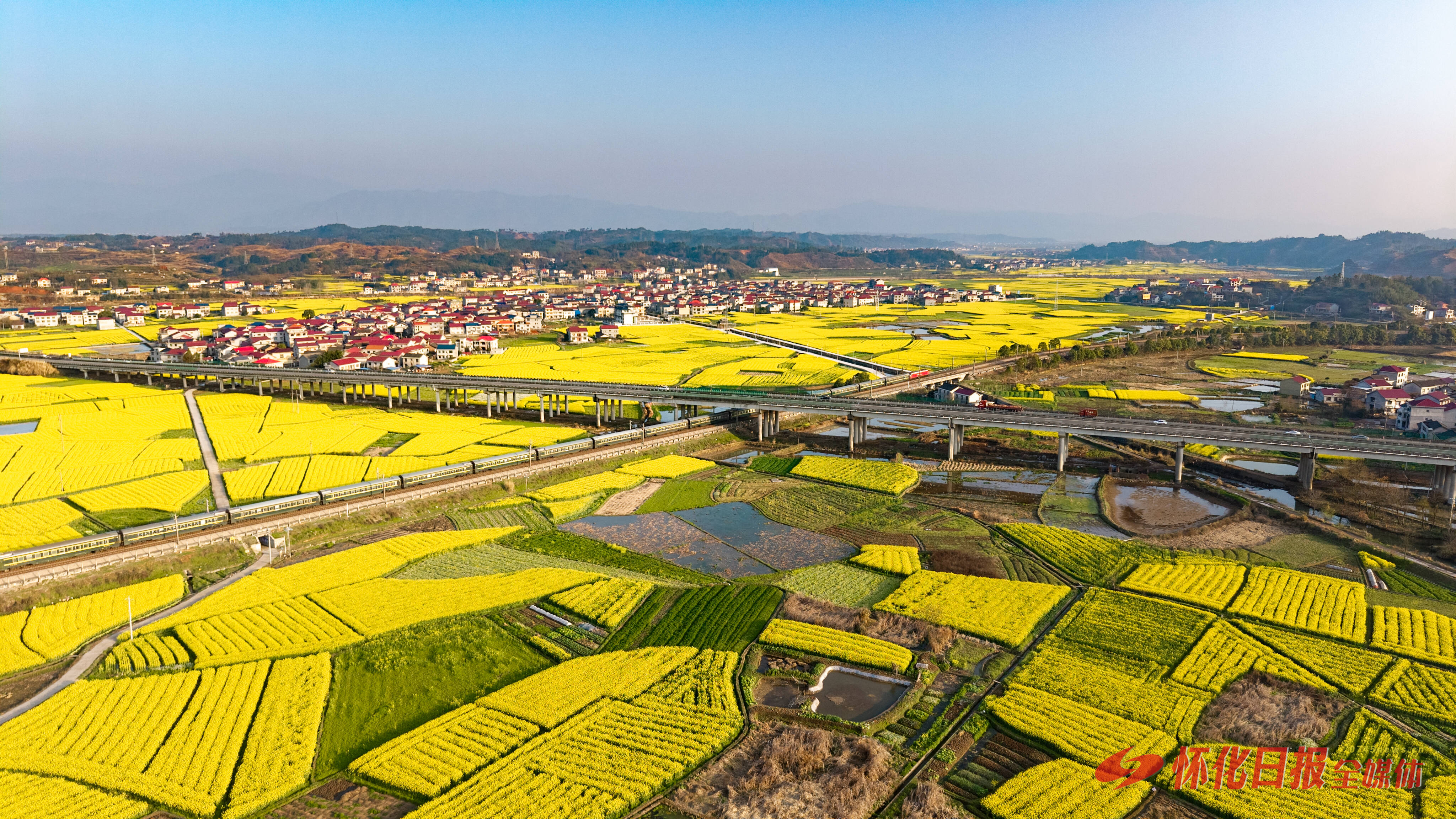 春日,溆浦县 30 多万亩油菜花竞相绽放,沪昆普速铁路、沪昆高速穿境而过,列车飞驰、车流穿梭,与金黄花海相映成画,勾勒出一幅生态美、产业兴、百姓富的春日盛景。(雷文录 摄)