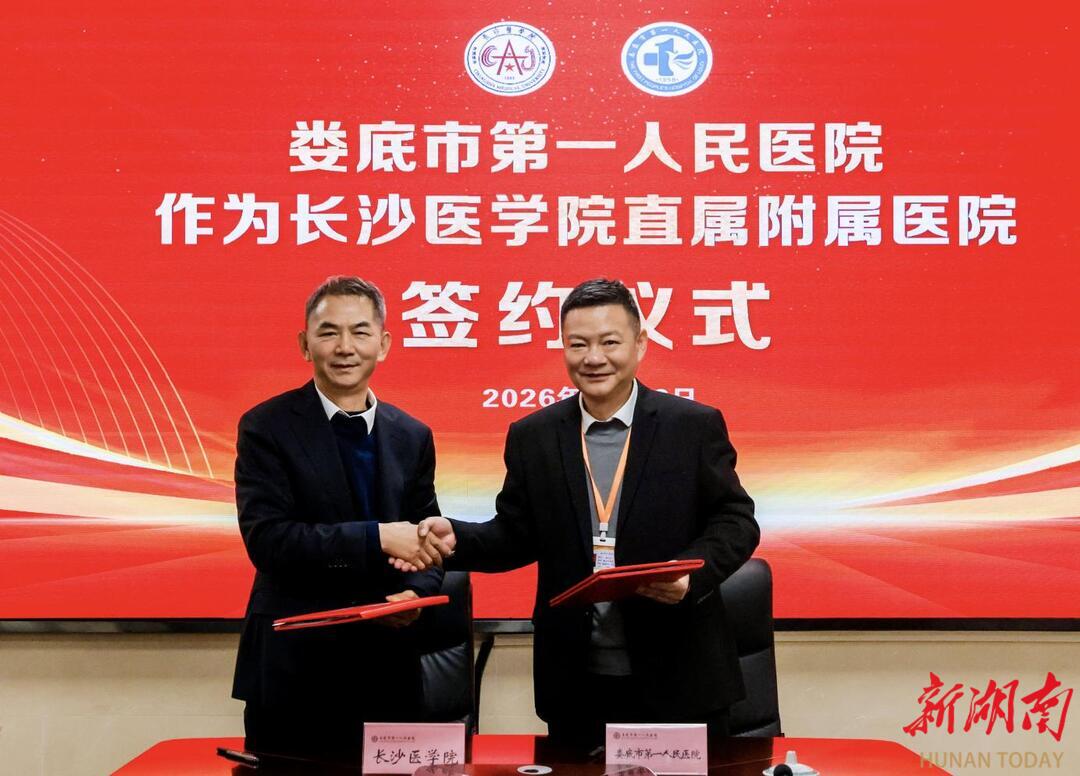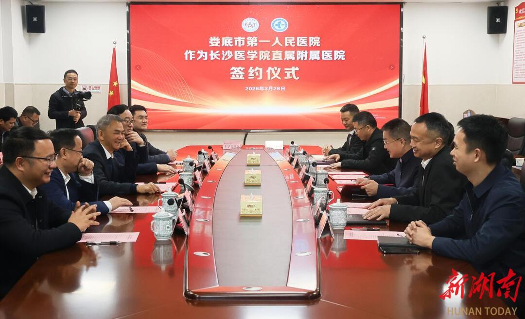 新湖南客户端3月26日讯(通讯员 于欣 熊丹宁 黄宇胜)3月26日,长沙医学院与娄底市第一人民医院直属附属医院签约仪式顺利举行。娄底市人民政府办公室副主任李国庆;娄底市卫生健康委员会党组书记曾祥文,党组成员、副主任周新发,党建宣传科科长胡旷世;长沙医学院校长何彬生,党委书记李世兵;娄底市第一人民医院党委书记蒋桂平,党委副书记、院长胡飞跃出席仪式,仪式由曾祥文主持。