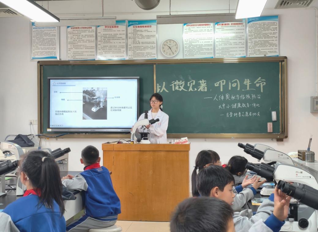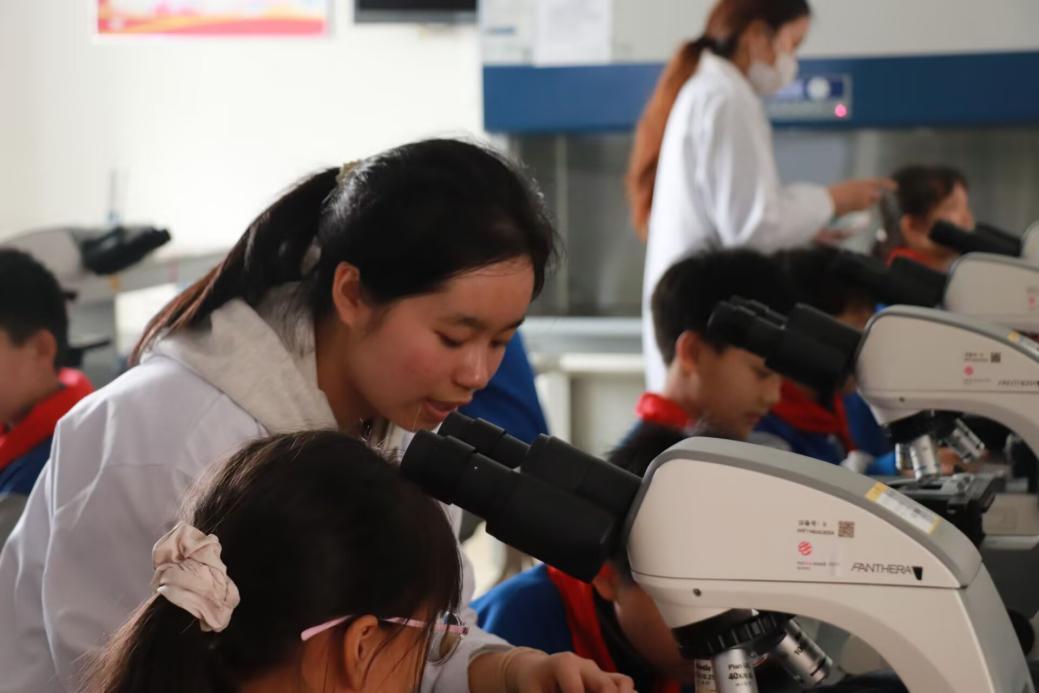 在显微互动实验室,趣味医学科普视频先行预热,志愿者用通俗易懂的语言,讲解显微镜操作规范和细胞结构知识。随后进入实操环节,志愿者手把手指导学生制作口腔上皮细胞标本,带领大家透过显微镜观察微观细胞结构,同学们全神贯注,沉浸在科学探索的乐趣中。