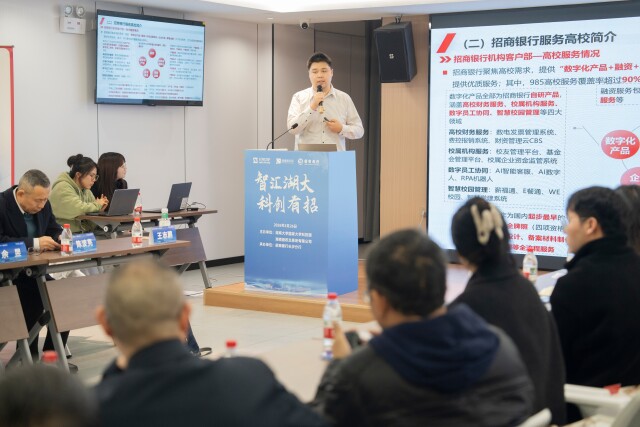 活动现场,招商银行总行相关专家就科技成果转化综合服务方案进行宣讲。目前,招行已与全国近百家高校及重点科研院所建立了伙伴关系,通过为科技成果转化项目导入资源、为转化企业提供综合金融服务、为科创基金提供募资服务搭建起早期科技项目从技术到市场的坚实桥梁。在股权融资、债券融资等方面,分享其自主研发的“产融通”系统搭载了项目库、资金库、科创企业库、“AI+股权评估”、招行智库等模块,以及“人才贷”“招翼贷”等定制产品。
