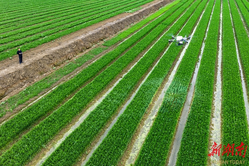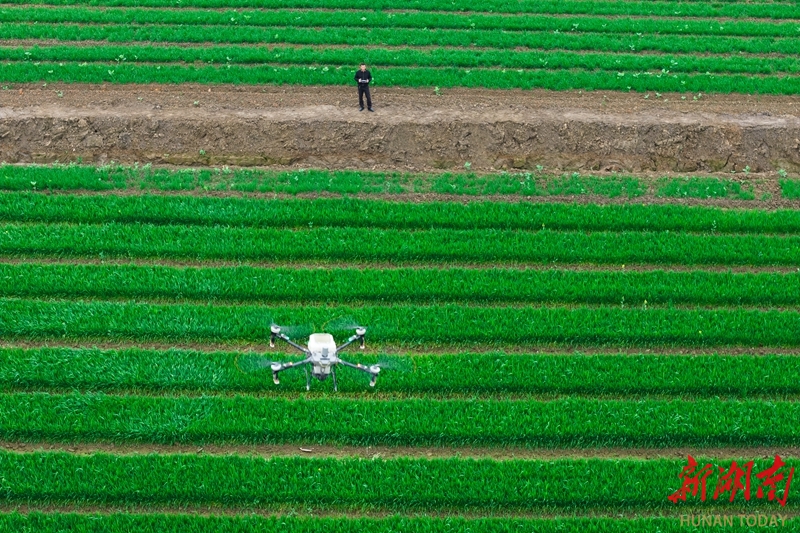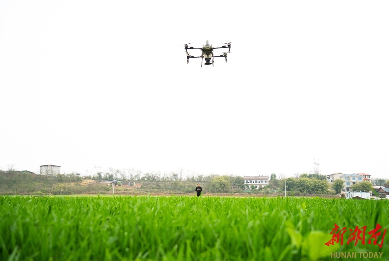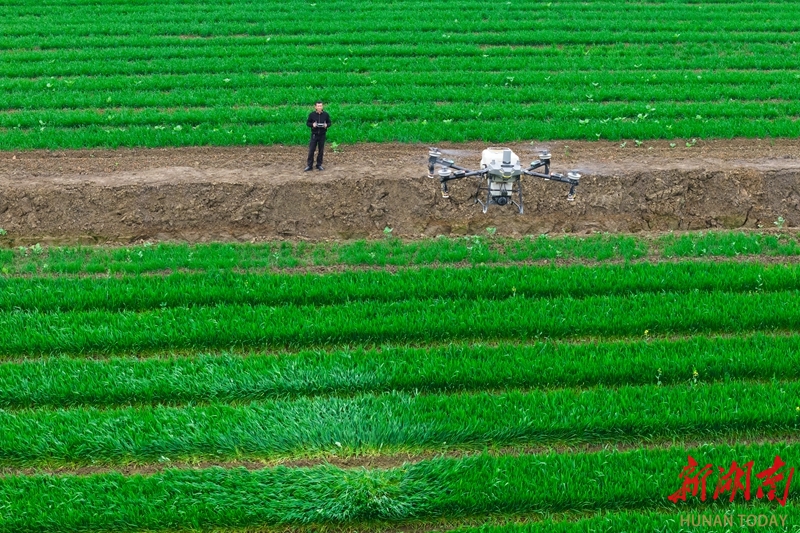 3月26日,永州市冷水滩区上岭桥镇八礼村,农机手操作无人机为冬小麦施肥。 近年来,当地加速推广智能化农机装备应用,让“科技范儿”融入田间地头,以科技赋能春耕春管,夯实粮食稳产丰收基础。雷中祥 蒋凌志 摄影报道(湖南图片库)