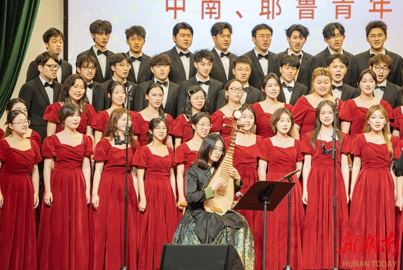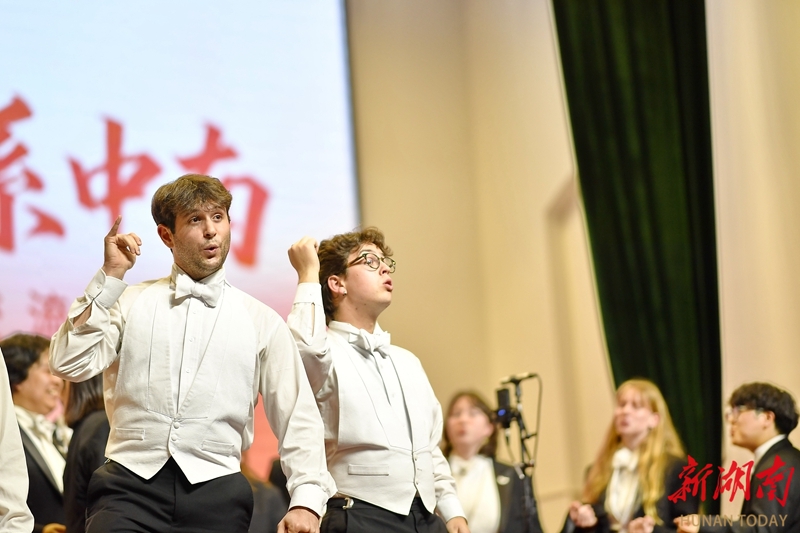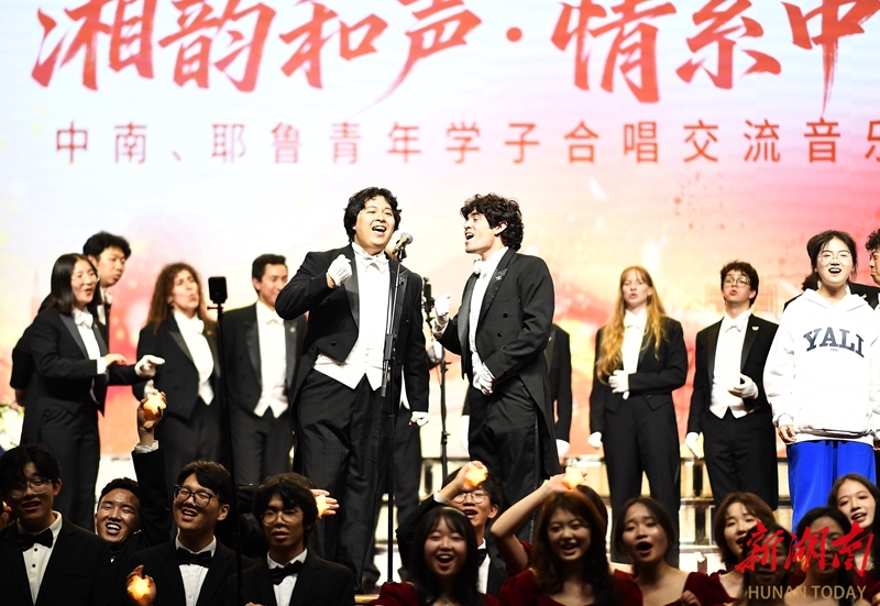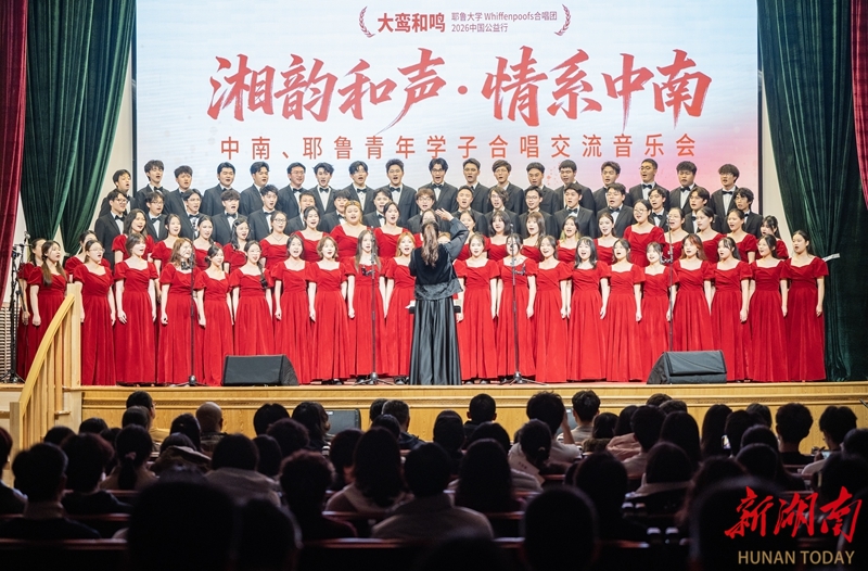 3月26日晚,“湘韵和声·情系中南——中南、耶鲁青年学子合唱交流音乐会”在中南大学开福校区礼堂举办。演出现场,耶鲁大学Whiffenpoofs合唱团、中南大学升华合唱团及雅礼中学合唱团联袂登台,为嘉宾和师生呈现了一场融汇中西的音乐对话。本次活动由北京大鸾翔宇慈善基金会与中南大学联合主办,旨在以音乐促进青年友谊。湖南日报全媒体记者 李健 童迪 摄影报道