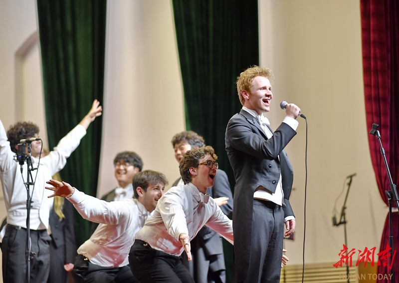 图为耶鲁大学Whiffenpoofs合唱团正在台上演出。 湖南日报全媒体记者 童迪 李健 摄影报道