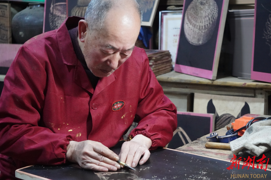 老艺术家汪宾芳伏案创作,以刀为笔镌刻农耕文脉。