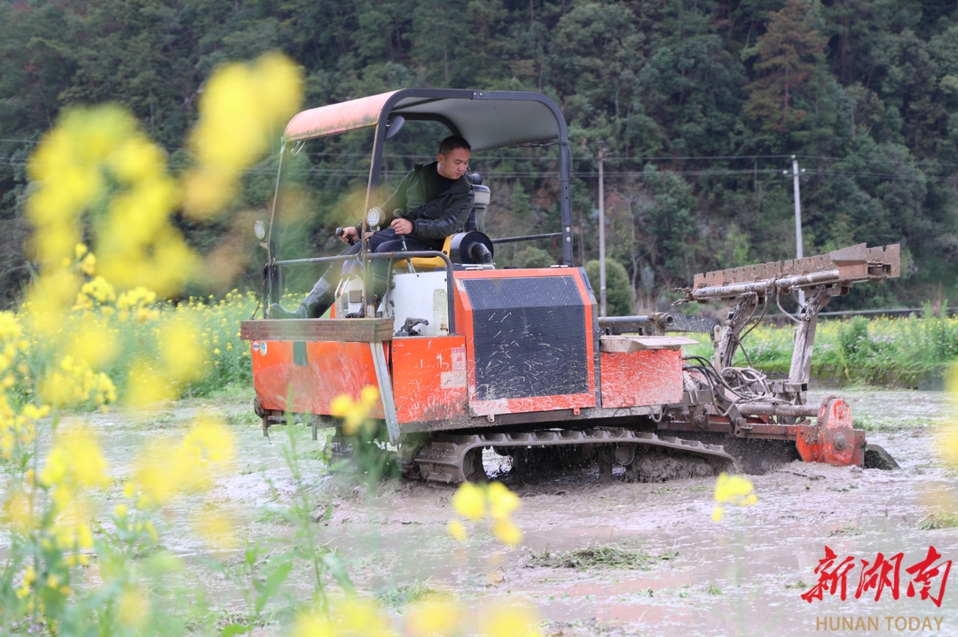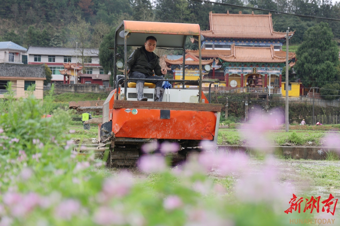 2026年3月26日,湖南省怀化市通道侗族自治县万佛山镇下乡村,农民驾驶农机在田间翻整地,为育秧播种做准备。