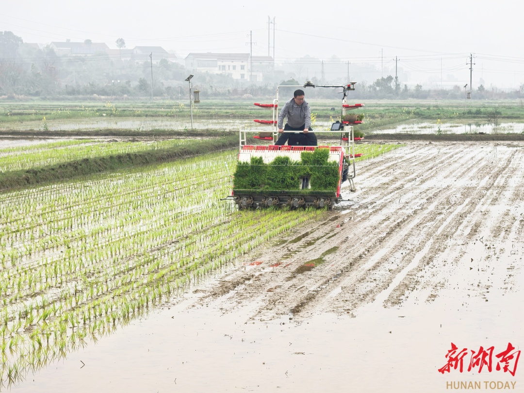 在岳阳县筻口镇丰瑞农机合作社,平坦开阔的高标准农田里,插秧机、抛秧机轰隆作响。不一会儿,新栽的秧苗给水田涂上一层淡淡的绿。