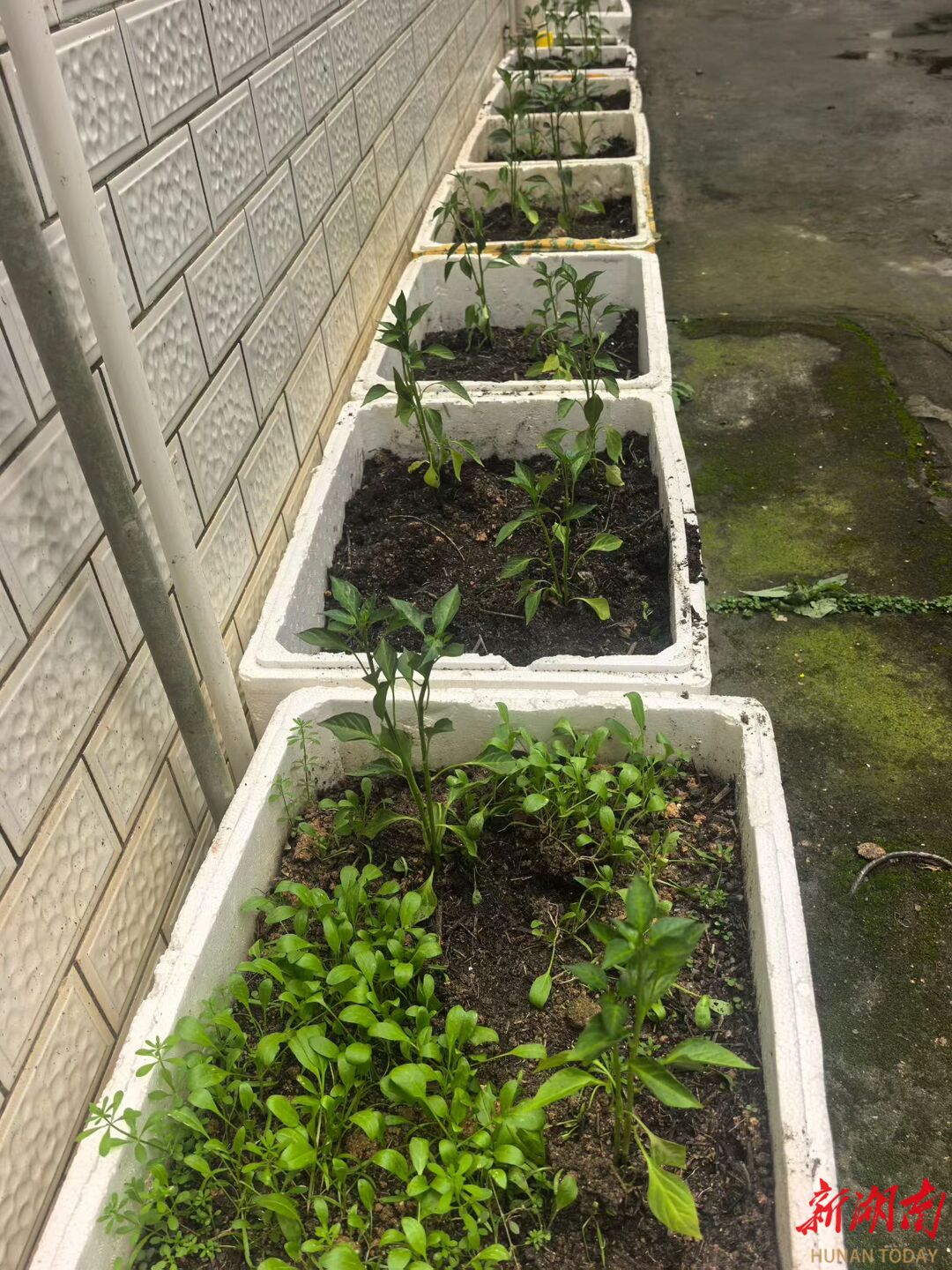 于是,我陆陆续续捡来十四个菜市场批发商丢弃的泡沫箱,一步步备齐种菜的家当。亲自从茶山上背回疏松的泥土,又去老表家拖来腐熟的羊粪,在住房四周的屋檐下,用十四个白色泡沫箱,开启了庭院种菜的生涯。