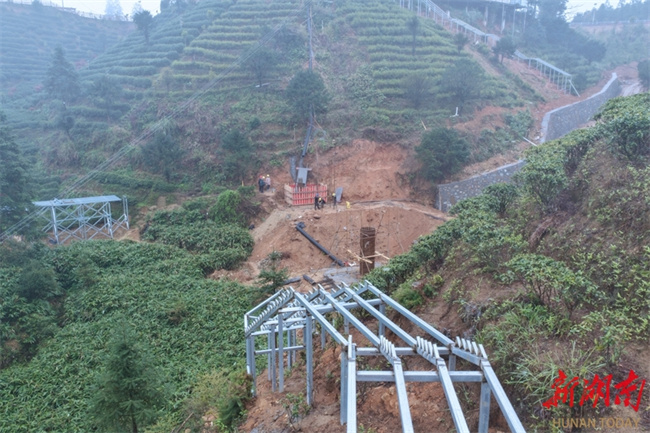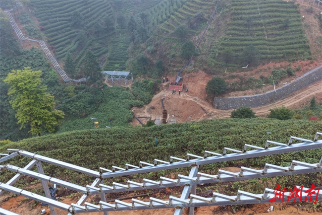 The photo shows workers racing against the clock to construct a tea garden tourism trail at the site of the tea-tourism integration project in Qingquan Town, Guidong County. The project is scheduled for completion in May and adopts a "work-for-relief" model, providing employment for 169 residents. As a key project to drive the development of the tea and reed leaves industries, the project highlights combination of "tea, culture, and tourism," with supporting facilities such as walking trails, viewing platforms, and a distinctive suspension bridge. Upon completion, the project will significantly enhance the town's brand influence of tea and reed leaves, promote the upgrading of the tea and reed leaves industries, and enable more residents to benefit from industrial development. (Photo/Deng Renxiang)