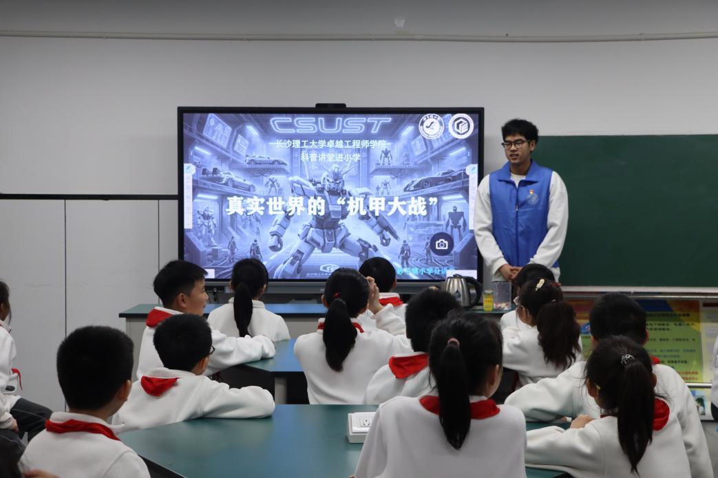 “哥哥,机器人的‘大脑’是芯片,那它的‘眼睛’就是摄像头吗?”砂子塘小学的同学们仰着头,向“蓝马甲”志愿者接连发问——这是近日在长沙理工大学卓越工程师学院“小小工程师,机甲梦启航”科普讲堂上的一幕。