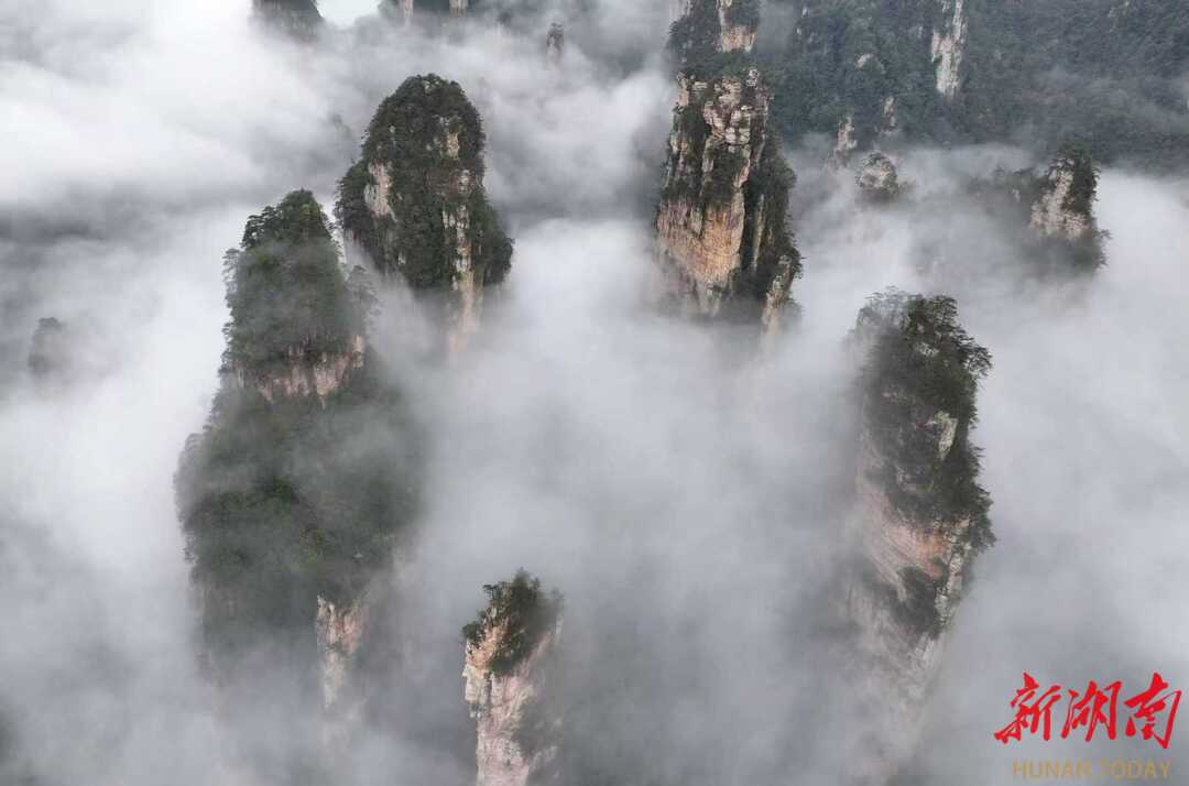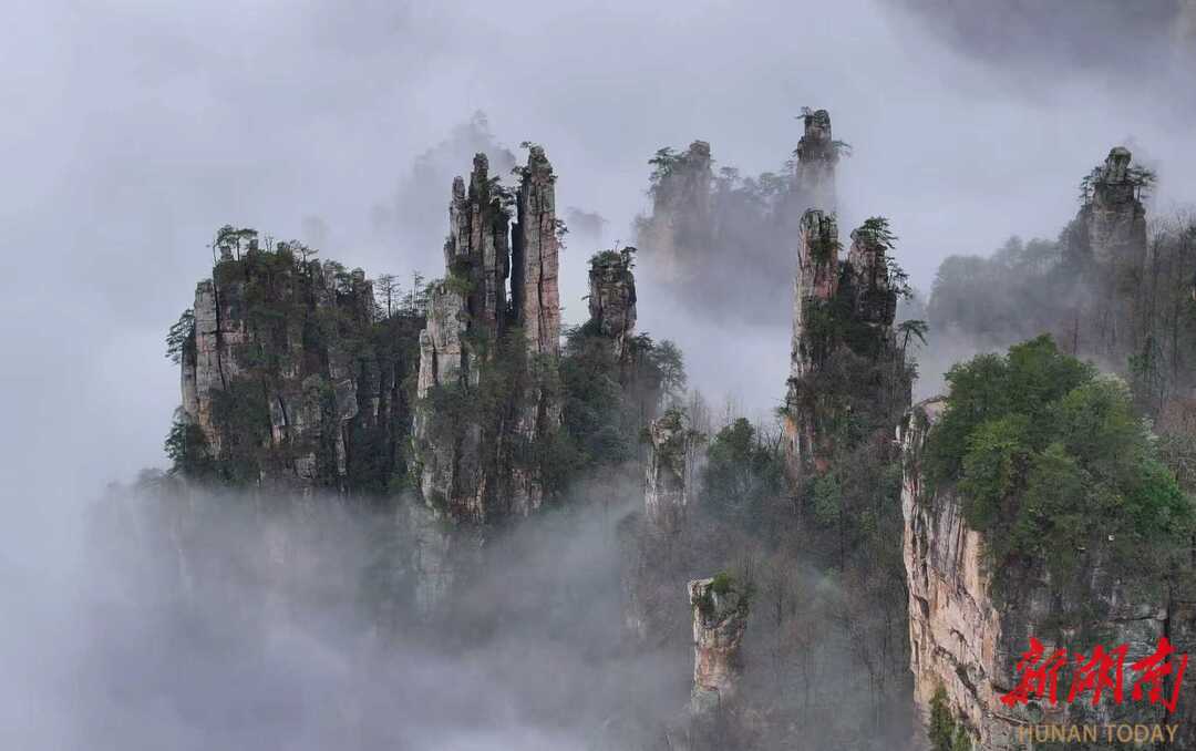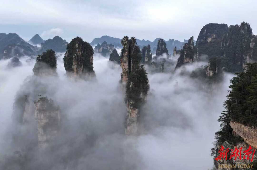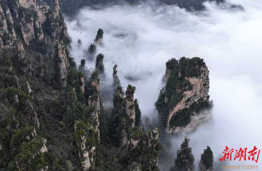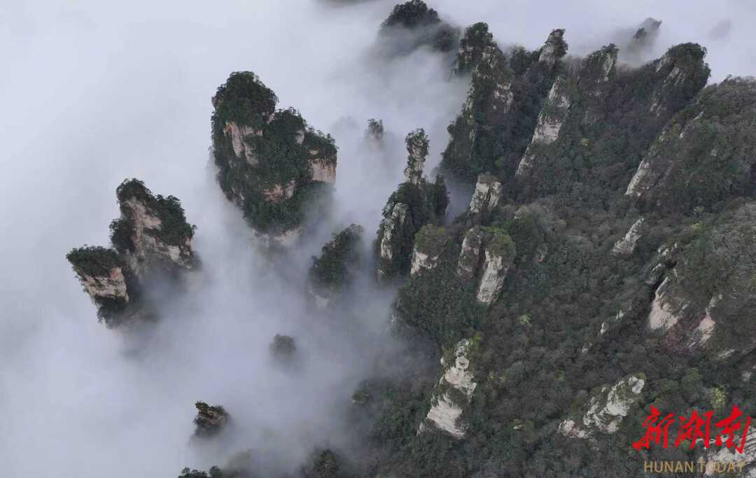 3月27日,春雨过后的湖南张家界国家森林公园出现壮美的云海景观,洁白的云雾在陡峭的峰林间变幻飘逸,宛如水墨画境。通讯员 吴勇兵 摄影报道