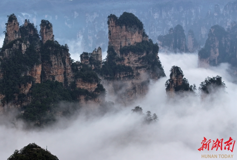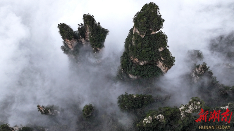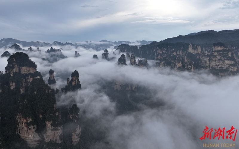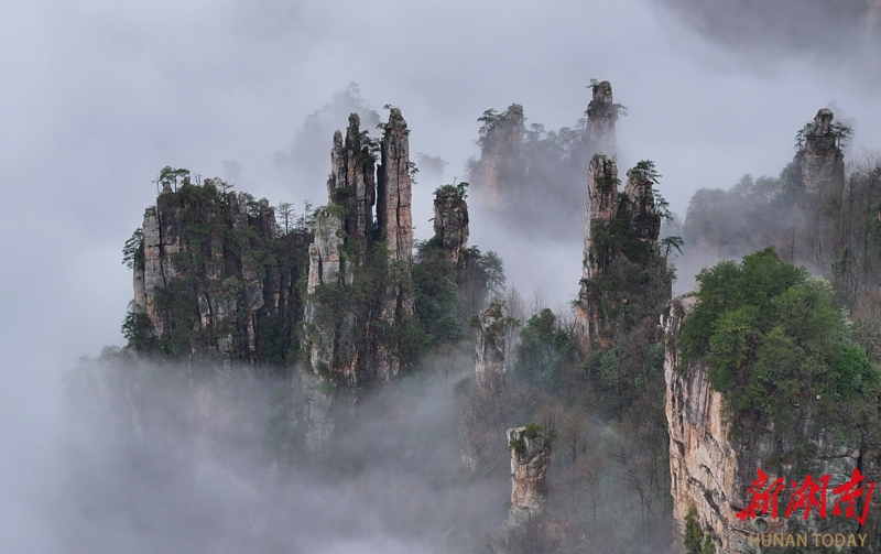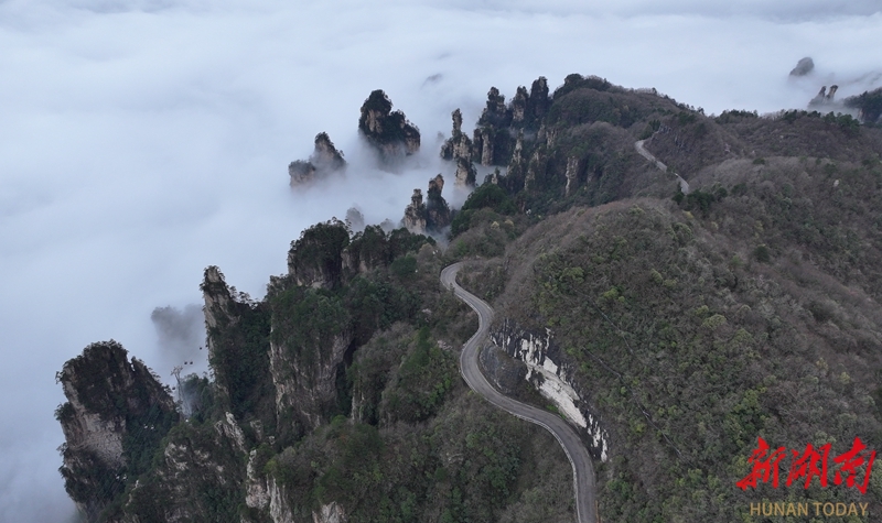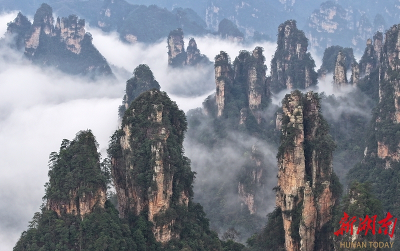 3月27日,春雨过后,张家界国家森林公园十里画廊出现壮美的云海景观,洁白的云雾萦绕峰林,时而聚散,时而升腾,宛如水墨画境。吴勇兵 摄(湖南图片库)