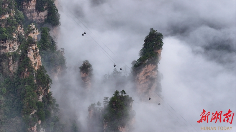 3月27日,春雨过后,张家界国家森林公园百龙天梯出现壮美的云海景观,洁白的云雾萦绕峰林,时而聚散,时而升腾,宛如水墨画境。吴勇兵 摄(湖南图片库)