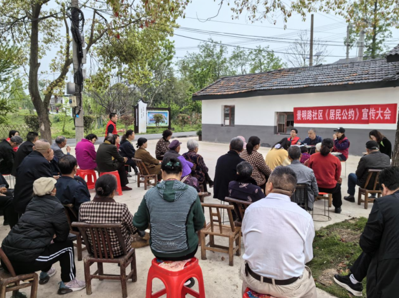 君山区柳林洲街道景明路社区新时代文明实践站在村文化活动广场开展居民公约宣传大会。“有了倡导标准,大家心里就有了一杆秤。”君山区良心堡镇七星湖村新时代文明实践站站长李云东说。