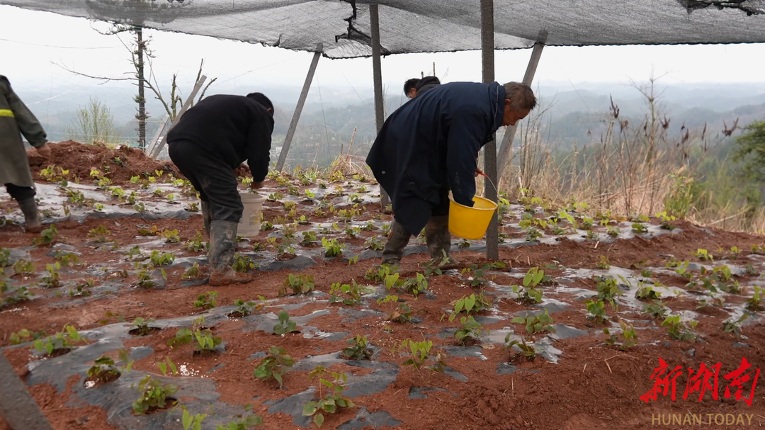 腊尔山镇科茸村平均海拔约800米,温暖湿润、雨量充沛的中亚热带山区气候,成为特色产业生长的“天然沃土”。村里131亩淫羊藿种植基地里,翠绿种苗吐露新芽,黑色遮阳网顺着山岗蜿蜒,村民们正忙着施肥管护。
