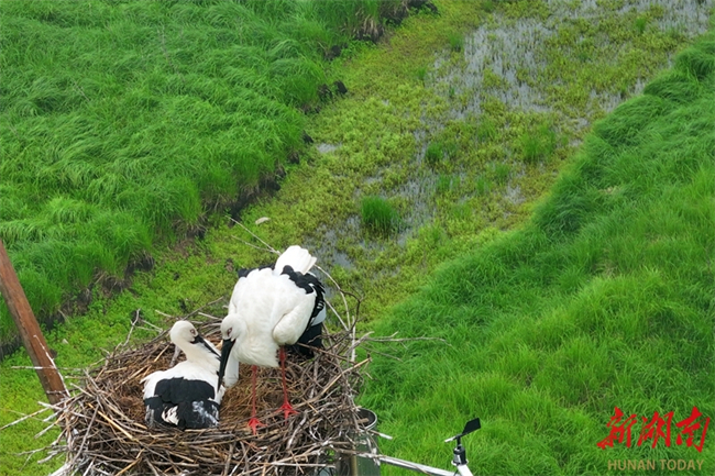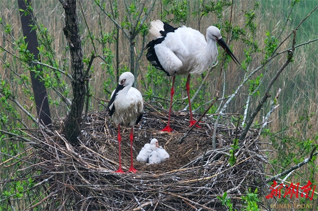 A couple of oriental storks guard their eggs atop a monitoring tower on Duogan Isle in the South Dongting Lake, Nanxian County. These eggs are expected to hatch by mid-April. Oriental storks, known as the "giant panda of birds," have settled down and multiplied here for three consecutive years, with a peak population exceeding 40 according to monitoring data. Leveraging multi-dimensional monitoring and systematic ecological management, the local authority has continuously improved the wetland habitat, demonstrating significant achievements in the ecological protection of the Yangtze River and the harmony between humanity and nature. (Photo/Zhao Chai and Song Mei, Hunan Daily)