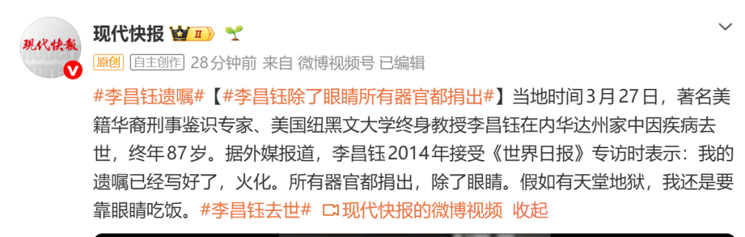 当地时间3月27日,著名美籍华裔刑事鉴识专家、美国纽黑文大学终身教授李昌钰在内华达州家中因疾病去世,终年87岁。据外媒报道,李昌钰2014年接受《世界日报》专访时表示:我的遗嘱已经写好了,火化。所有器官都捐出,除了眼睛。假如有天堂地狱,我还是要靠眼睛吃饭。