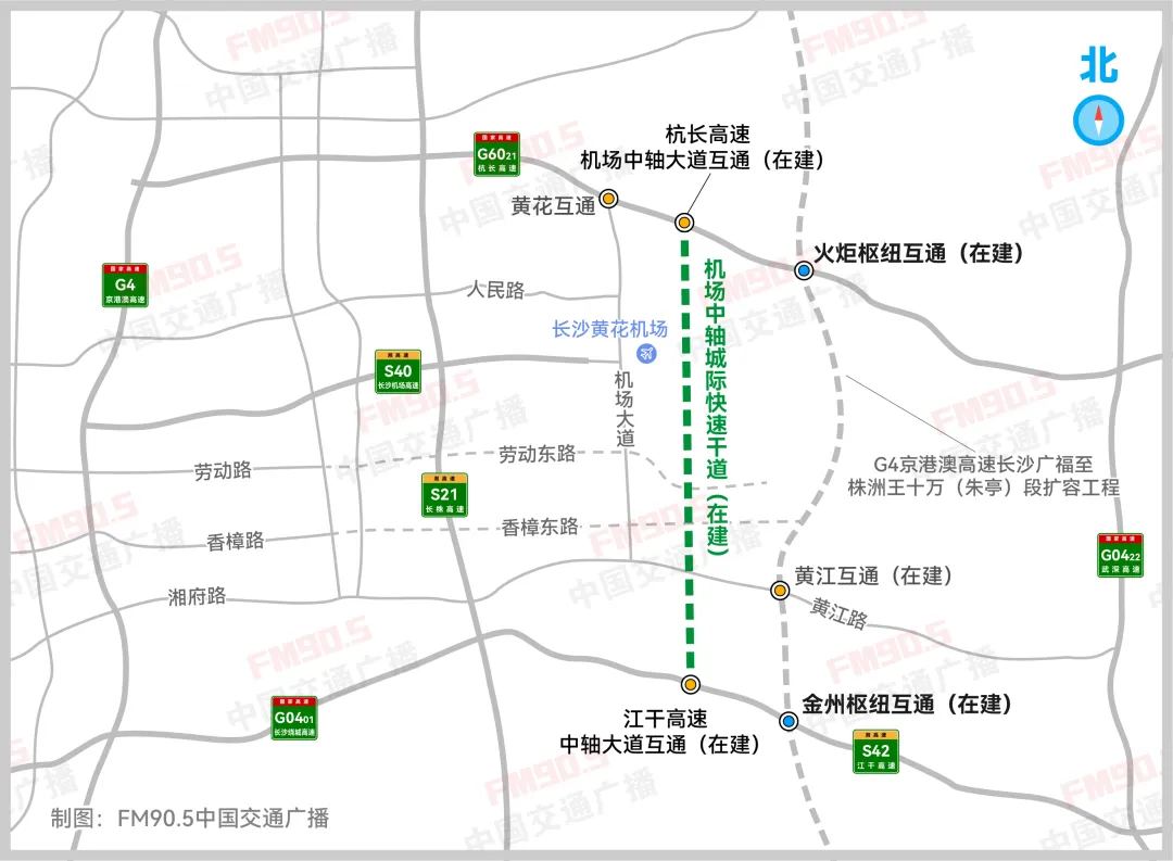 未来,随着两个互通项目的相继建成,长沙黄花国际机场可通过机场中轴城际快速干道接入既有高速,构建起更加立体、高效的交通运输网络。
