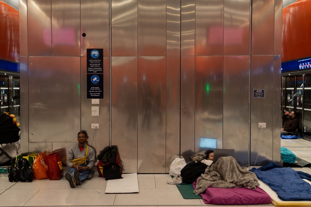3月2日,在以色列特拉维夫市中心的一处地铁站台,人们准备过夜。新华社 图