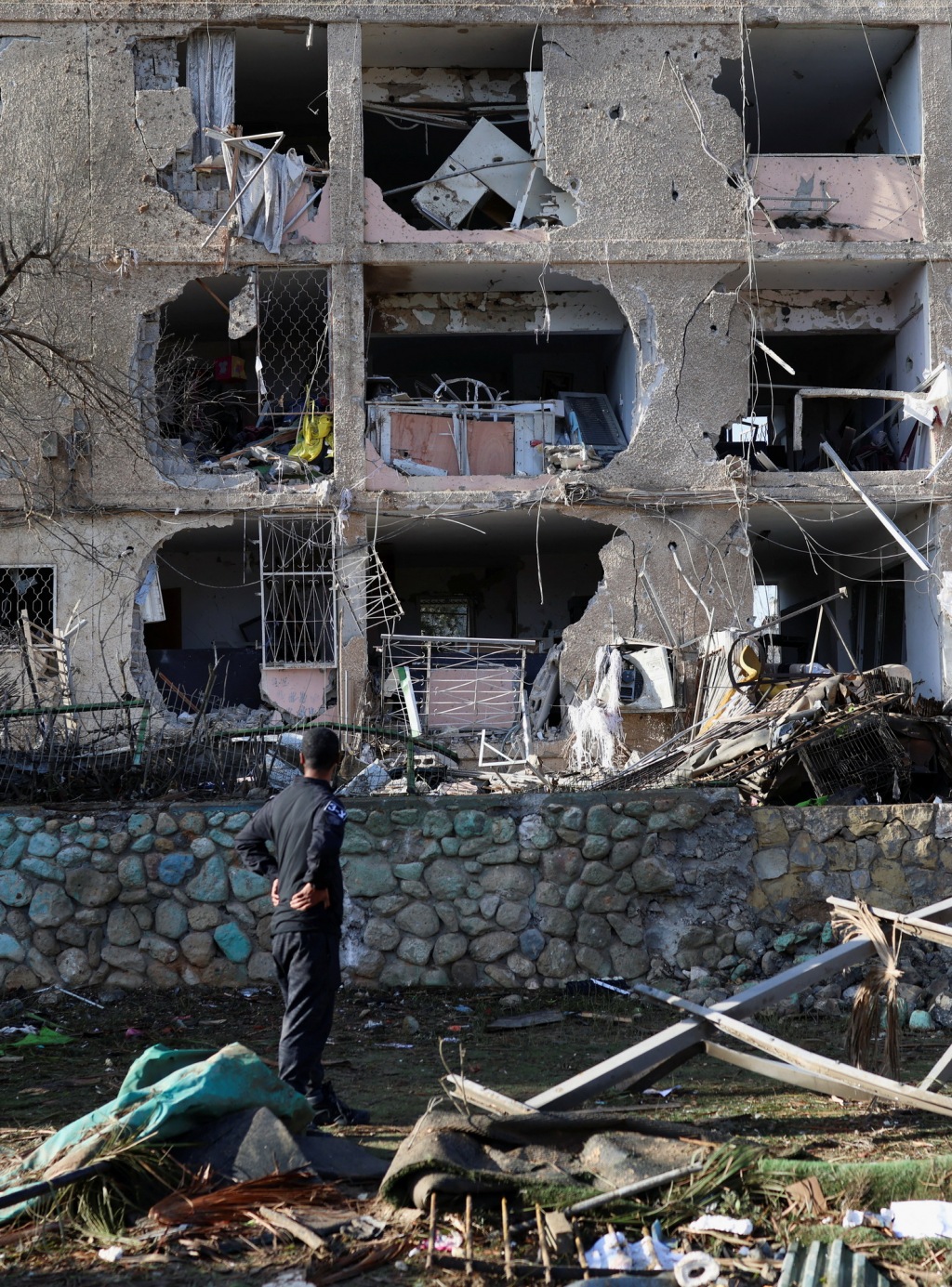 3月22日,在以色列南部城市迪莫纳,一名男子站在一栋遭袭受损的建筑物前。新华社 图