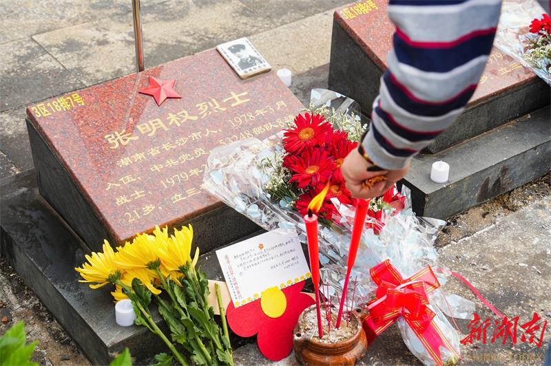 这温情的一幕,不只是发生在靖西。当天上午,在广西龙州、宁明、匠止、南山、那坡的烈士陵园里,由长沙市天心区湘府英才小学、长沙市天心区青园小学、长沙市明德金鹰学校、长沙市天心区黄兴小学等学校以及中南林业科技大学法学协会的学生书写的充满致敬语句的卡片和小红花,被一一敬献给了近150位长沙籍烈士。