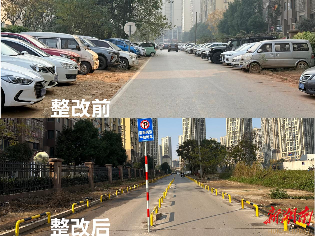 川和苑小区北侧阳泰路道路车辆乱停乱放、人车混行隐患突出问题整改前后。