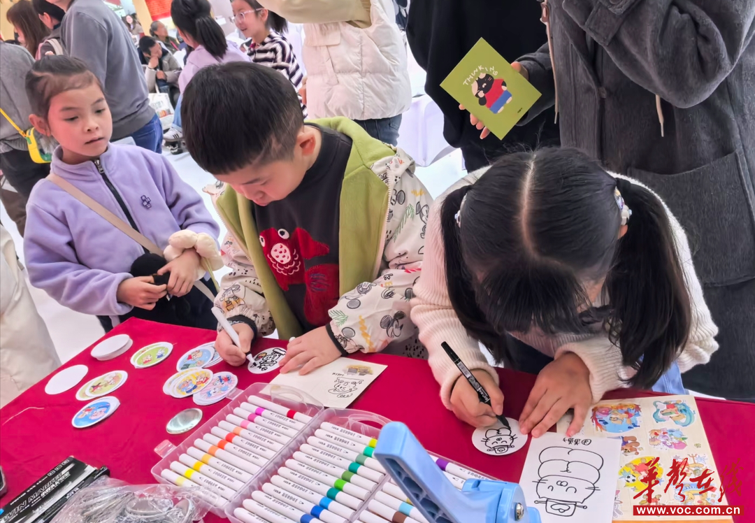 “你看!这是我画的笨狼和书香猫手拉手!”一个小男孩骄傲地向妈妈展示自己的作品,然后小心翼翼地将徽章别在胸前。旁边的小姑娘则一口气做了好几枚徽章,说要带回去送给班上的好朋友。