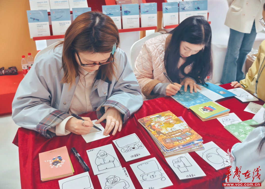 道道子老师则讲述了“书香猫”形象的诞生故事,并分享了如何从日常生活中捕捉灵感、将其融入文创设计的创作心得。两位插画师的分享深入浅出,孩子们听得入神,不时爆发出欢快的笑声。分享环节结束后,两位插画师为孩子们现场绘制简笔小像。
