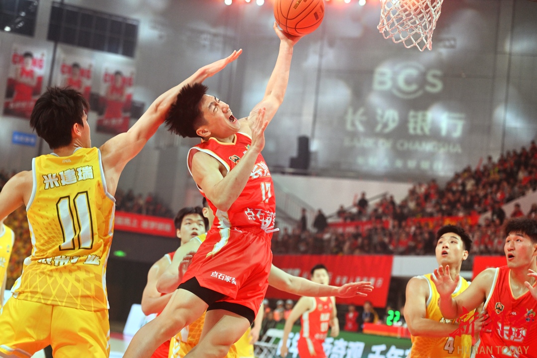 3月27日晚,长沙队球员(红)与怀化队球员(黄)在比赛中。湖南日报全媒体记者 郭立亮 摄