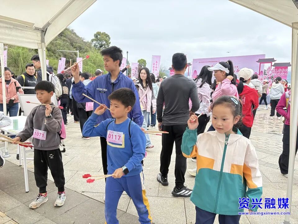 清晨的桃花广场已是热闹非凡。签到区前,参赛者们有序领取定制参赛包和号码贴,脸上洋溢着期待。本地民俗歌舞轮番上演,欢快的旋律赢得阵阵掌声;桃花主题乐队倾情献唱,歌声伴着湖风在山谷回荡;桃花仙子巡游、汉服小姐姐快闪表演惊艳登场,衣袂翩跹间尽显东方韵味。射箭、投壶、踢毽子等趣味游戏体验区前排起长队,大家在欢声笑语中感受着活动的热烈氛围。