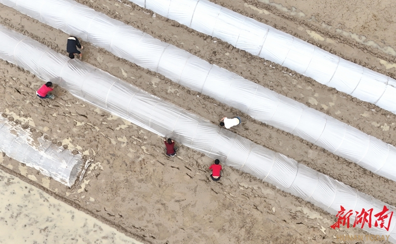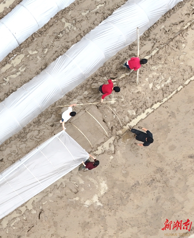 3月28日,江永县潇浦镇,农民在早稻秧田铺设地膜。春分过后,天气回暖,当地农民抢抓农时开展春耕春播生产,田间地头一派繁忙景象。田如瑞 摄(湖南图片库)