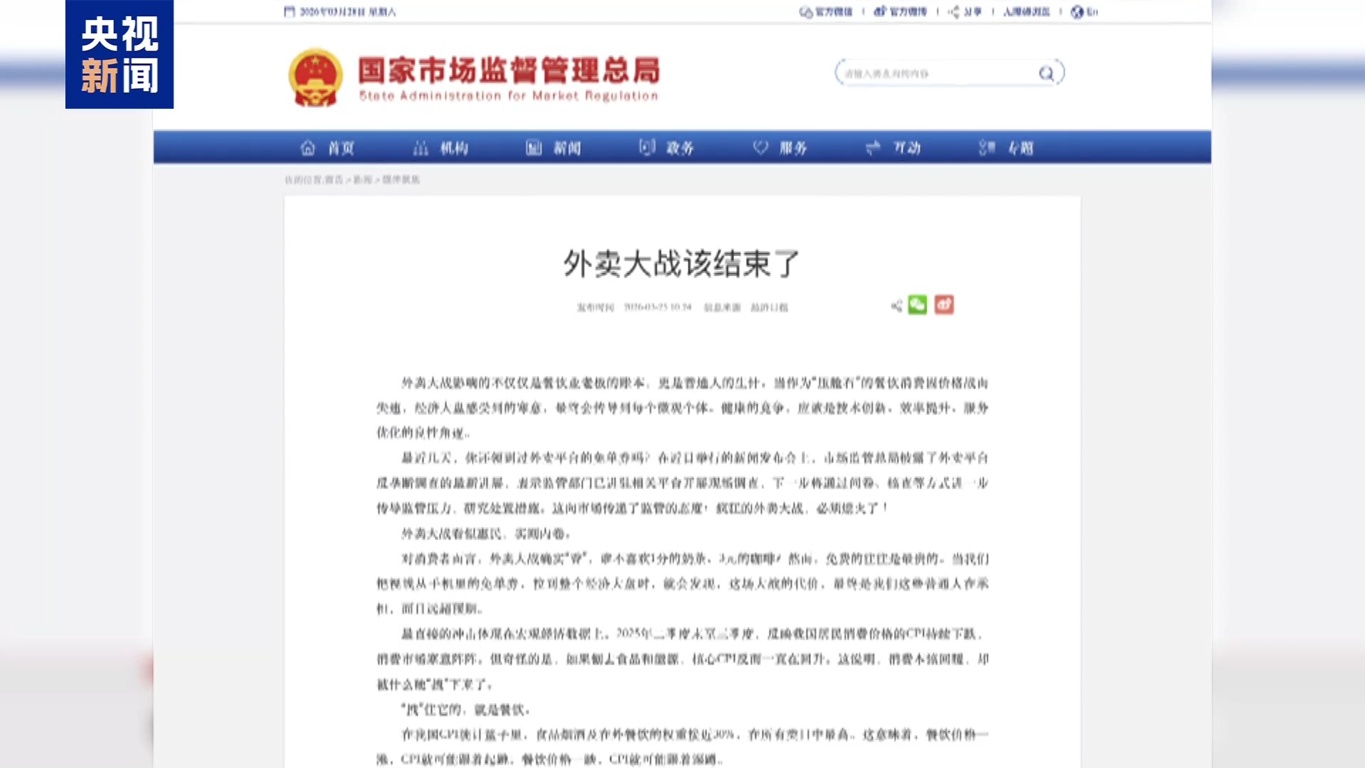 - 紧接着,国家市场监督管理总局官网刊登媒体文章,明确喊出“外卖大战该结束了”。