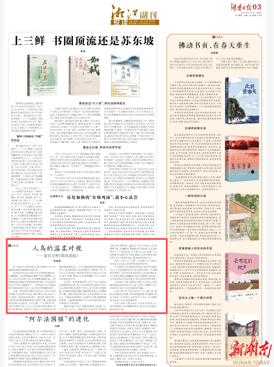洞庭湿地的“鸟生”短暂却潇洒,它们越千山万水,择一方水土,筑巢安家,自由自在。作者将它们比作“犀利哥”,道其有“仰天大笑出门去”的潇洒气度,还铺陈有“跨越肤色”的浪漫。也正是作者放下了人类的身段,以平等之心与鸟共情,才让这些描写充满生活气息的温情,让我们真实地感受到“鸟生”的喜怒哀乐,感受到别样的宇宙。