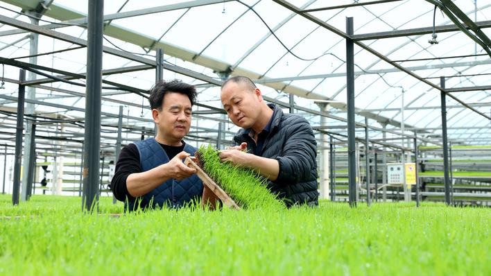 乡农业综合服务中心工作人员程罗成告诉记者,这批秧苗出苗齐、长势壮,得益于大棚内精准调控的温度和湿度,再有一周左右时间便可移栽到大田。