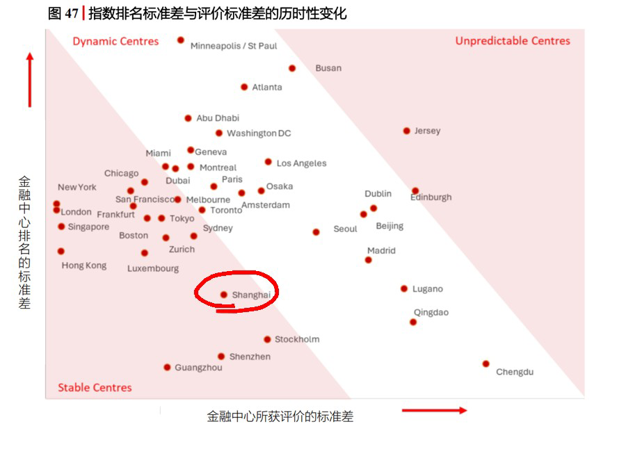 ・上海是全球顶尖金融中心中抗波动能力极强的梯队:全球从业者对其评价标准差仅135,评价共识度高,竞争力基础扎实。