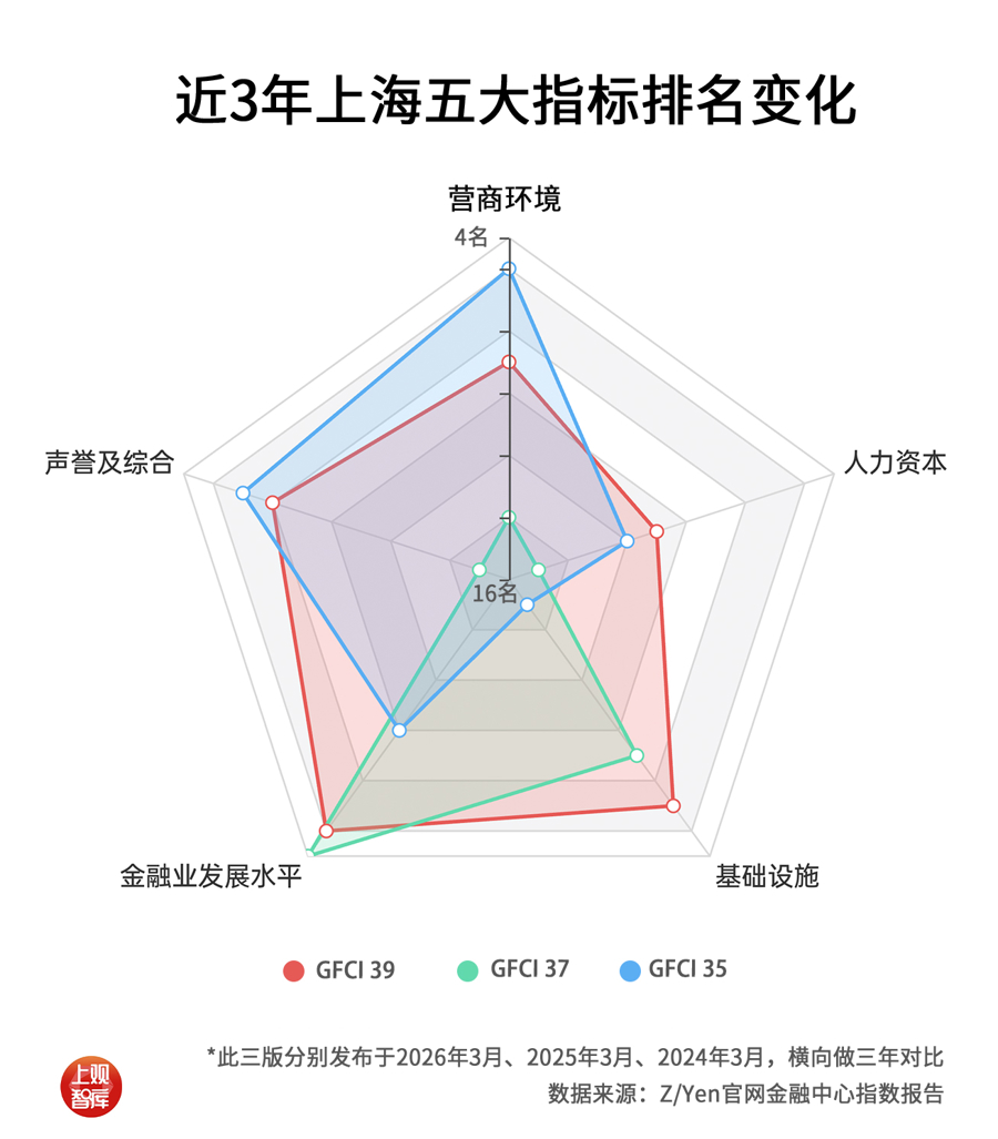 ・上海位次跃升的内因,则是各项指标更加均衡:金融业发展排名跃升至全球第5位,营商环境、声誉实现显著回升,重回全球前十行列;基础设施维度保持稳定高位,为综合排名提供了扎实的底层支撑。