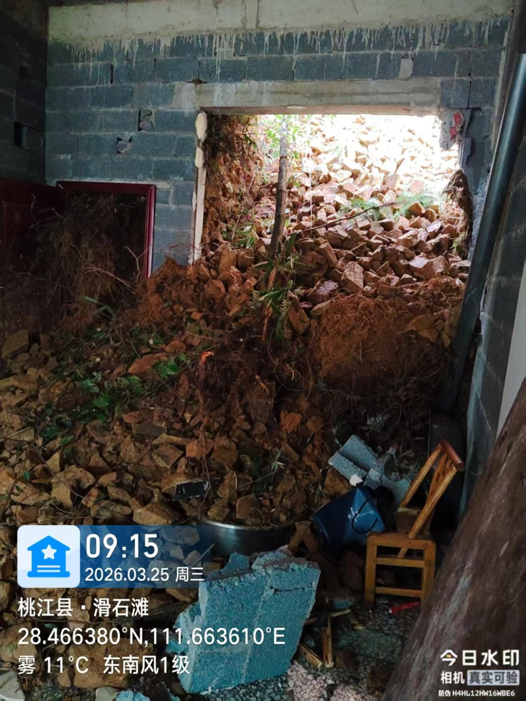 19时40分许,该户屋后发生山体滑坡。因人员转移及时、处置到位,未造成人员伤亡。