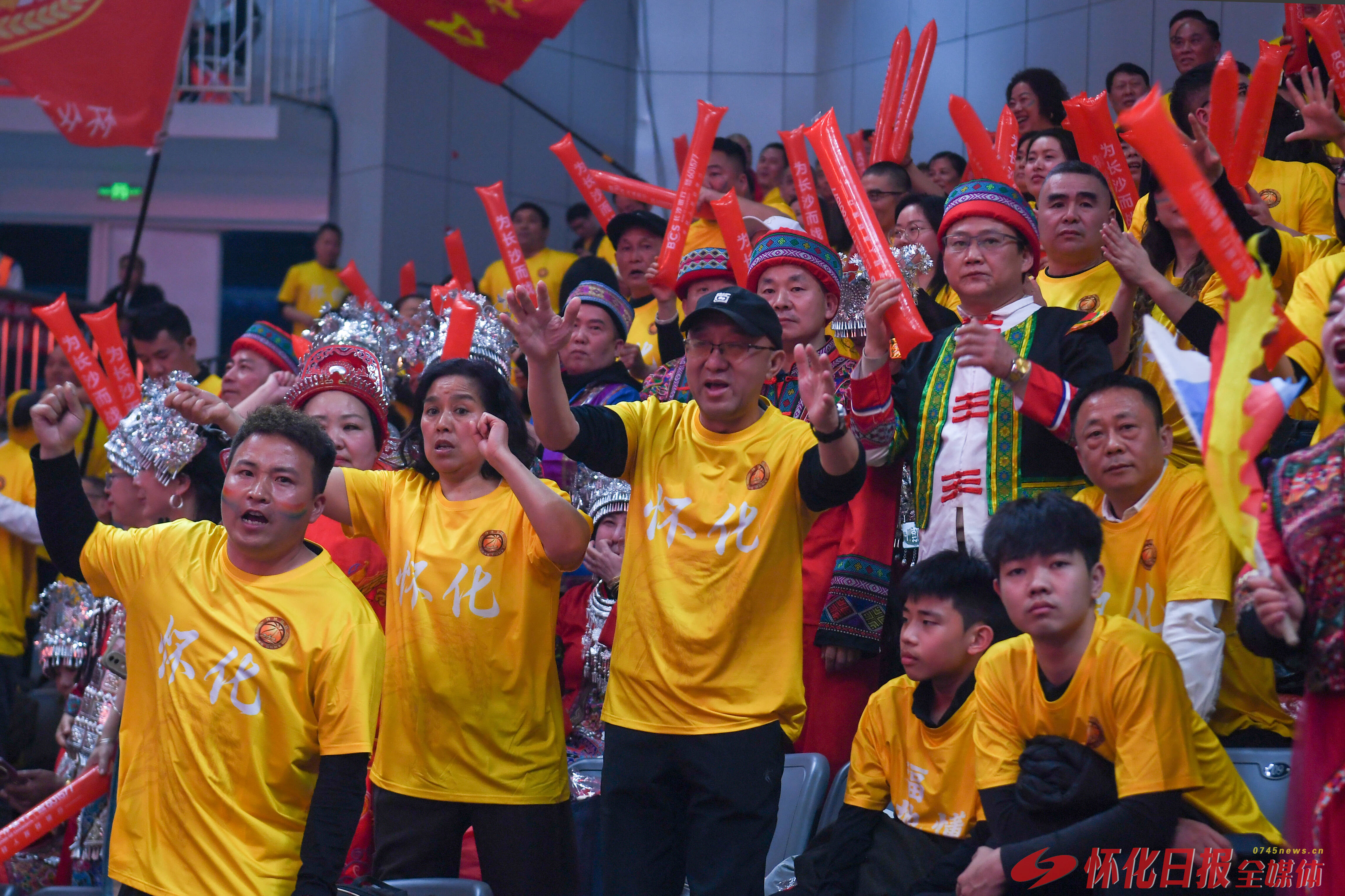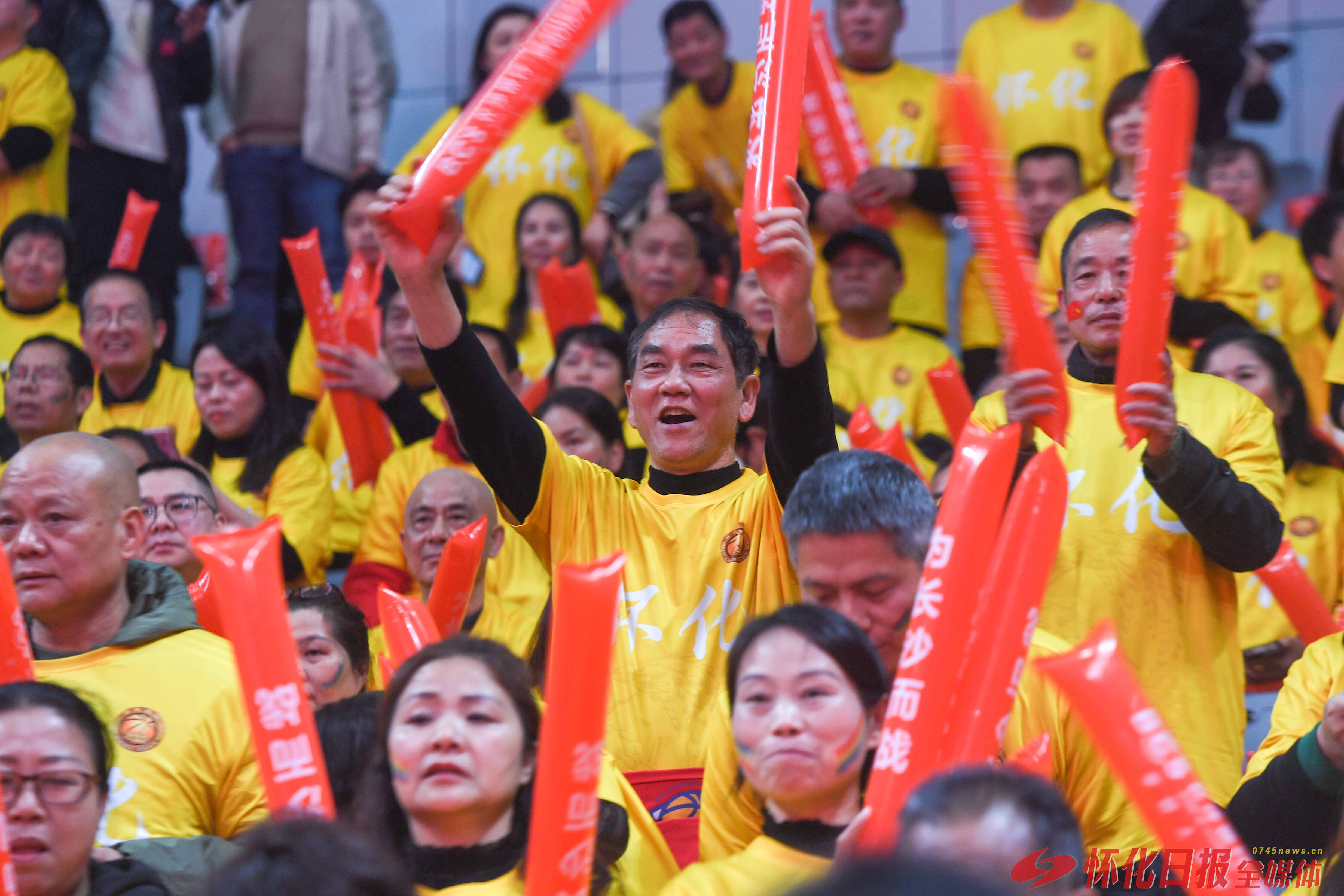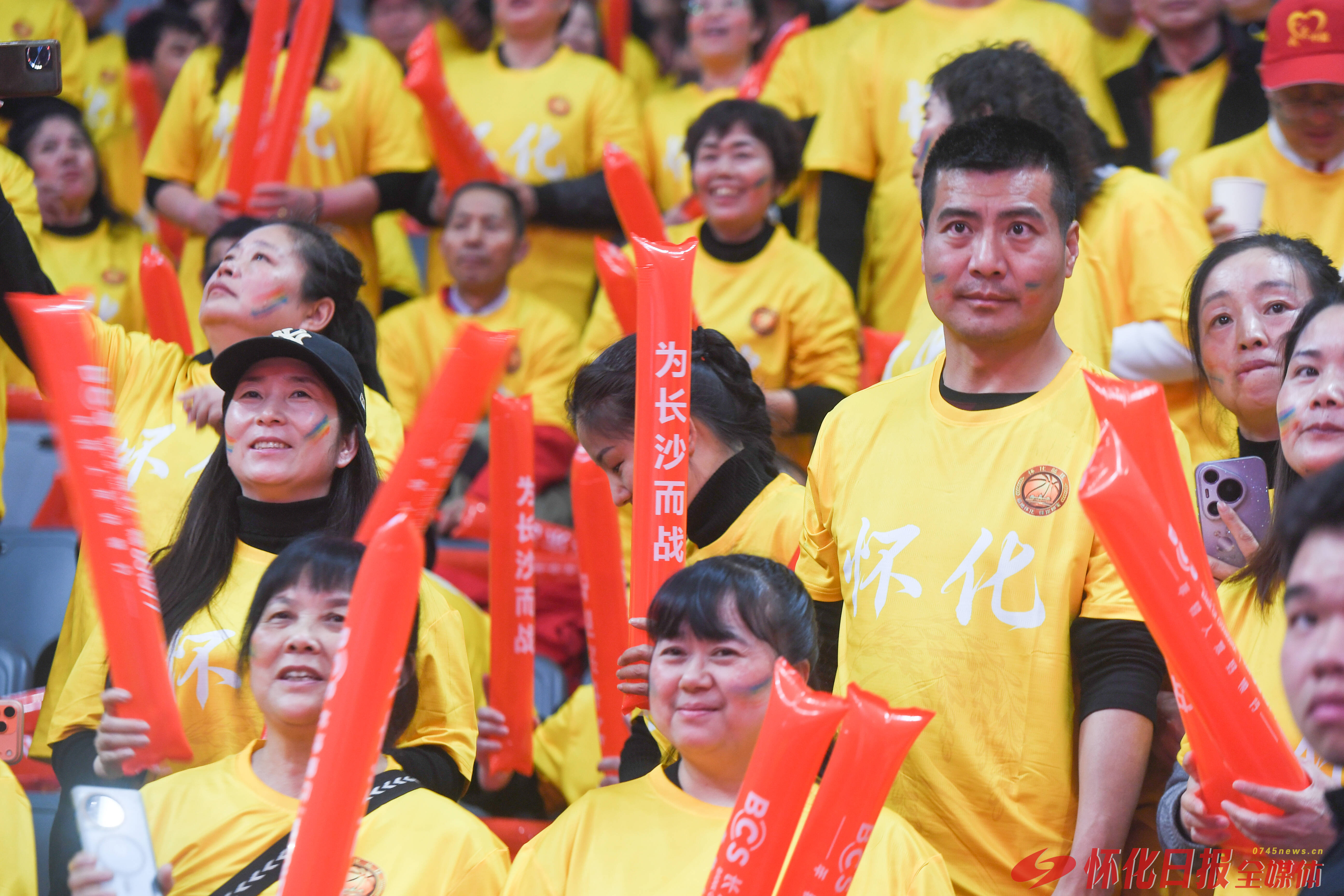 3月27日晚,湘BA揭幕战在长沙贺龙体育馆打响,怀化队客场对阵长沙队。北区看台,数百名怀化球迷身着统一黄色助威服,组成整齐方阵,为怀化队呐喊助威。(怀化日报全媒体记者 杨智伟 摄)