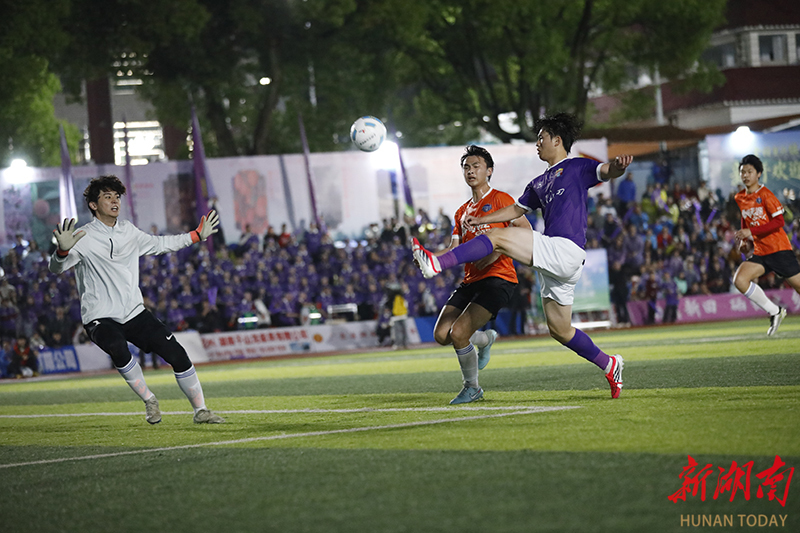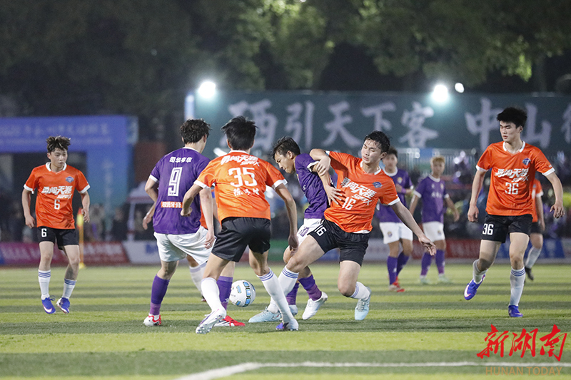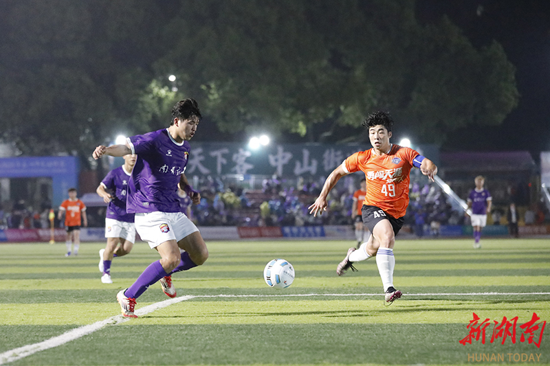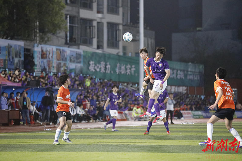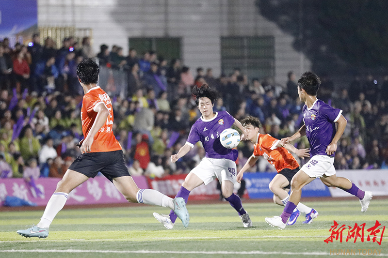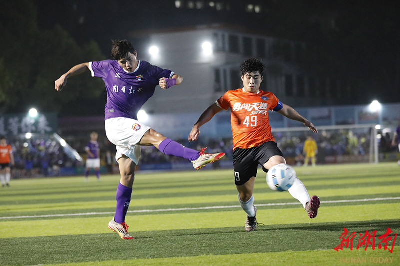 3月28日晚,南有新田队(紫)和冷水滩勇闯天涯(橙)球员在场上展开激烈拼抢。当天,2026年永州市足球超级联赛第二轮在新田县二中体育场进行激烈比拼。上半场第10分钟,南有新田队79号胡怀超率先破门。下半场开场仅5分钟,21号刘成宇利用角球机会头球得分;不到1分钟后,9号司华韦华再下一城,将比分扩大为3比0。第75分钟,司华韦华完成梅开二度。最终,南有新田队以4比0战胜冷水滩勇闯天涯队。钟伟锋 摄