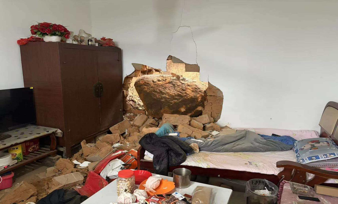 卧室墙体被巨石砸穿