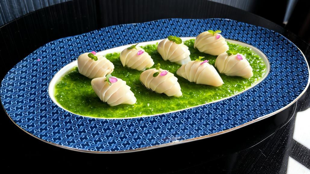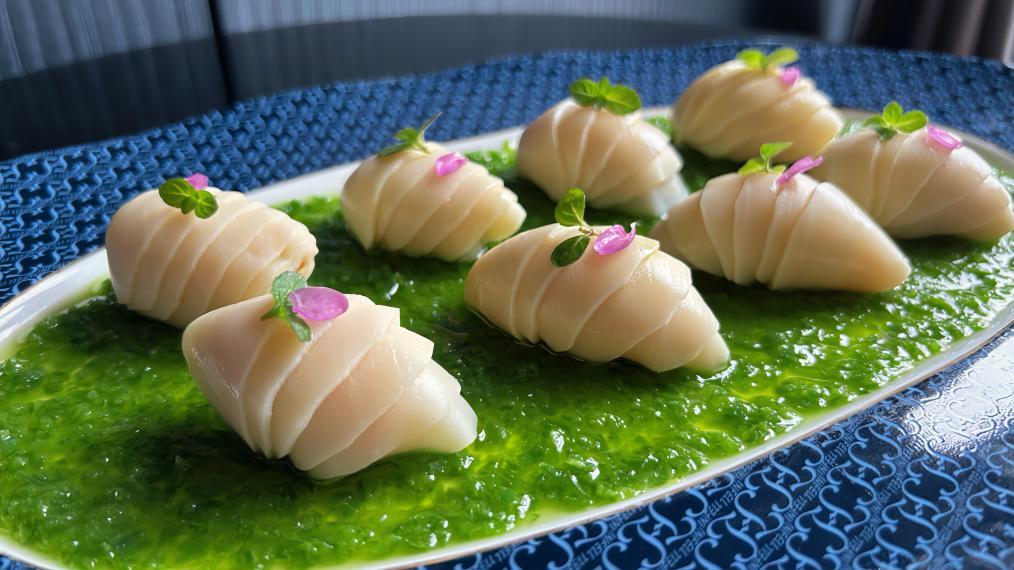 做法朴实不花哨,全程不倚重浓油重辣:先将春笋片摆好造型,放入炒香的配菜,用保鲜膜轻塑成圆润球状定型,简单锁住汁水;最后摆盘淋上调制好的葱香汁,一道春日美味便成了。